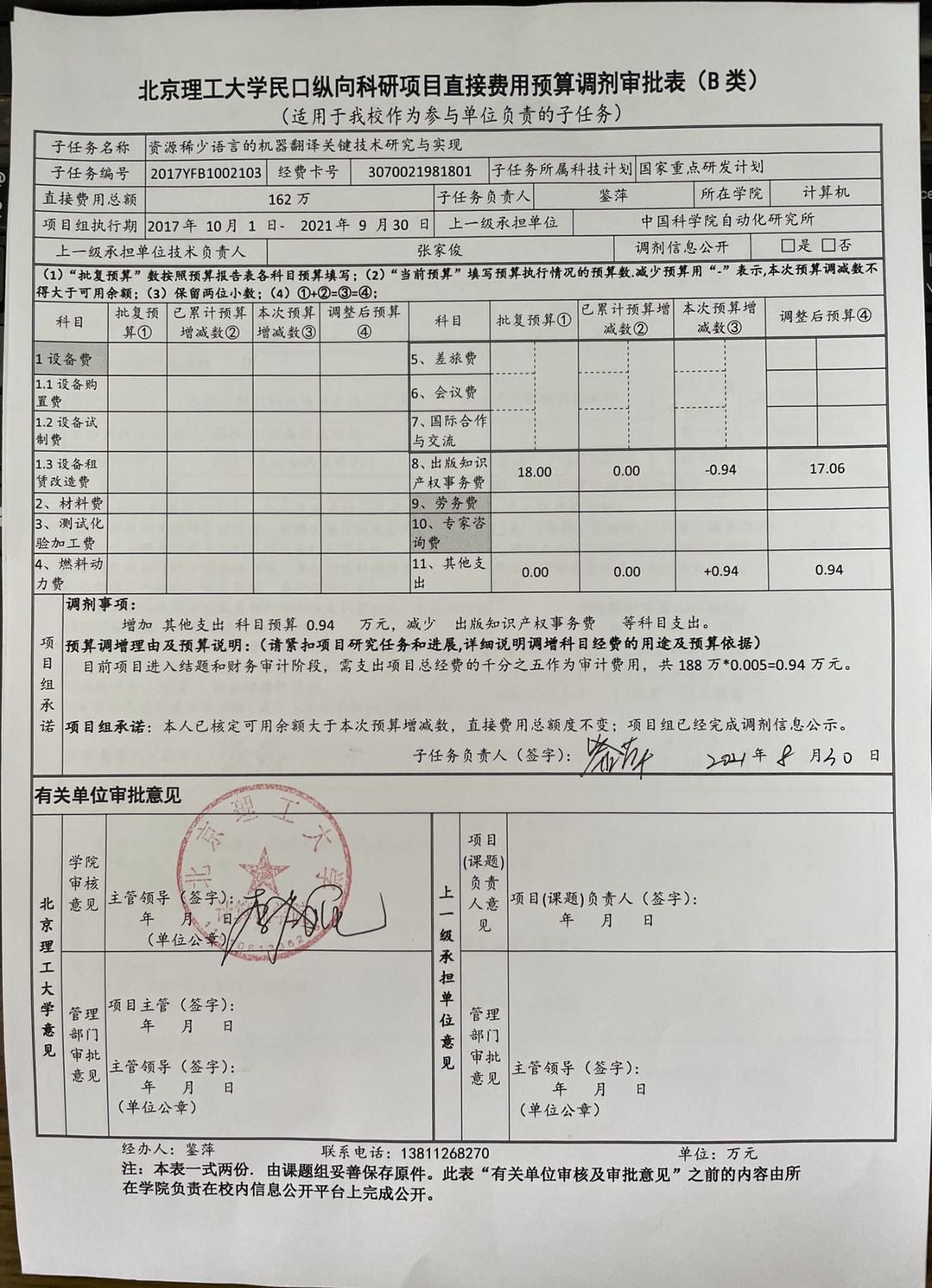 项目2017YFB1002103预算调剂公示