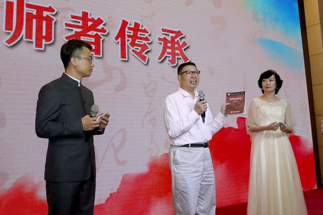 韩伯棠在2019年荣休仪式上向新入职教师赠书