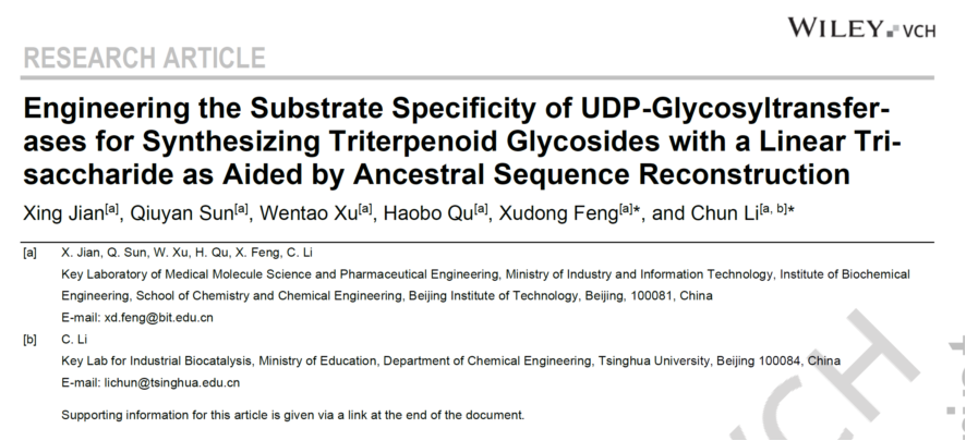 三萜化合物是一类重要的植物天然产物,因其独特的药理活性而受到广泛关注。然而,由于分子中的疏水碳环结构,三萜化合物普遍存在溶解度低和生物利用度差的问题。糖基修饰可显著改善三萜化合物的水溶性,因此三萜化合物多以糖苷的形式存在。其中,直链三糖基修饰是一种重要的糖基修饰类型,对发挥三萜化合物独特的药理活性具有重要意义。相较于化学合成法,利用酶法合成三萜糖苷化合物具有反应条件温和、定向催化和环境友好等优势,特别是在合成具有复杂多糖基修饰的三萜糖苷化合物时,酶法可避免化学合成法中繁杂的基团保护与去保护过程。尿苷二磷酸-糖基转移酶(uridine diphosphate glycosyltransferases,UGTs)是催化天然产物糖基修饰的主要生物催化剂,在目前已报道的UGTs中,大多仅催化三萜单糖苷和二糖苷的合成,具有直链三糖基修饰催化活性的UGTs数量极少,限制了三萜直链三糖苷的酶法合成。此外,该类型UGTs的催化功能特点和底物特异性的分子机制也不清晰。针对以上问题,本研究通过生物信息学分析、结合体外酶学性质表征系统发掘可催化合成三萜直链三糖苷的UGTs,并揭示该类型UGTs催化底物的结构特点,通过祖先酶序列重构、氨基酸突变和计算机模拟等手段阐明其底物特异性的分子机制。相关研究成果以“Engineering the Substrate Specificity of UDP-Glycosyltransferases for Synthesizing Triterpenoid Glycosides with a Linear Trisaccharide as Aided by Ancestral Sequence Reconstruction”为题目在国际知名期刊Angewante Chemie International Edition上发表(DOI: /10.1002/anie.202409867)。北京理工大学化学与化工学院博士研究生简行为该论文的第一作者,清华大学李春教授与北京理工大学化学与化工学院长聘副教授冯旭东为该论文的共同通讯作者。