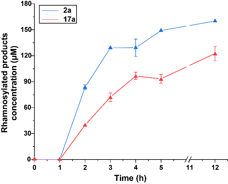 针对糖基供体UDP-Rha成本高的问题,构建了包括蔗糖合酶 Gu SUS1-Δ9、UDP-Rha 合酶 At RHM2和双功能鼠李糖合酶 At NRS/ER的三酶级联体系,实现了以廉价的蔗糖为原料合成UDP-Rha。将该体系与UGT91H_A1偶联的四酶体系(分步法)降低了甘草次酸 3- O -GlcA-Gal-Rha(2a)和常春藤皂苷元 3- O -Ara-Rha-Rha(17a)的合成成本,底物转化率分别达到80.1 ± 0.3%和61.3 ± 4.1%。
