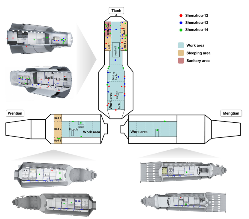 在轨空间站舱内有很多背板狭缝区域是航天员的“不可及”区域,常爆发微生物却很难被清理到,所以是在轨空间站的微生物防控工作应给予关注的重点区域。该论文首次全面研究了建造期在轨中国空间站中“不可及”区域的微生物的来源、数量丰度及群落演替规律。神舟12到神舟14乘组在轨执行任务期间,协助研究项目组在核心舱、梦天实验舱和问天实验舱的工作区、卫生区和睡眠区总共采集了50个在轨微生物样品。研究分析了这些区域的可培养及全部微生物污染数量范围以及高丰度的微生物种类。结果表明,乳酸杆菌作为一种人体益生菌广泛分布于舱内所有区域,舱内不存在强致病菌但存在多种条件致病菌。舱内没有粪便源微生物污染,所有微生物有58.8%来源于航天员的皮肤及口腔,舱内所有区域的微生物污染类群会随乘组更替发生显著性变化,天和核心舱的生物标志物是一株来源于植物的寡养单胞菌。所有结果一定程度指示着,在轨中国空间站后期微生物安全防控工作可以在人源和植物源的微生物的污染方面加大防控力度,尤其是在轨开展相关植物培养实验过程中应尽量控制根际土壤微生物扩散到舱内空气和航材表面等。