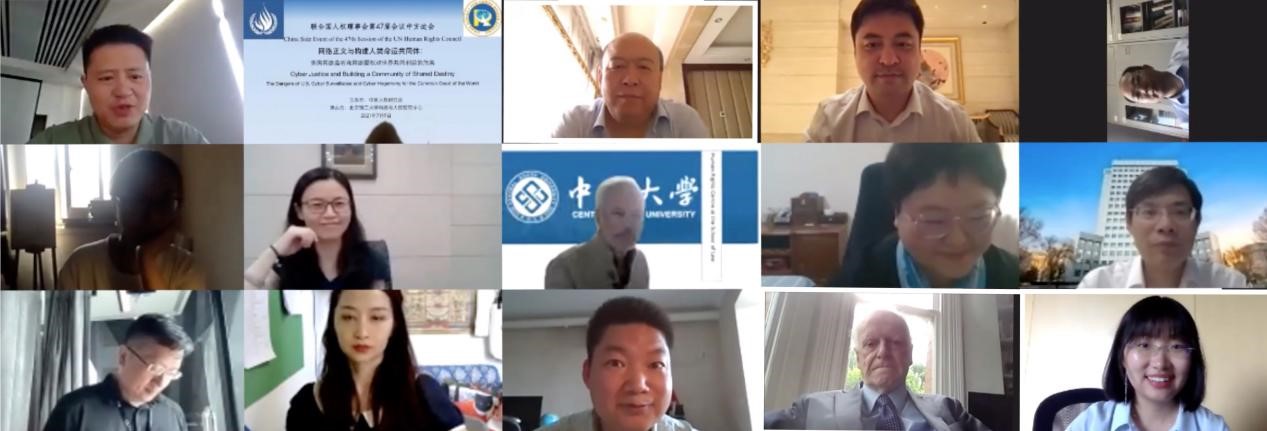 北京时间7月9日下午,由中国人权研究会主办、北京理工大学科技与人权研究中心承办的联合国人权理事会第47届会议中方边会《网络正义与构建人类命运共同体:美国网络监听和网络霸权对世界共同利益的危害》(线上)顺利举行。国内外九位专家针对美国大规模网络监听行为所带来的危害进行了深刻揭批,并从美国网络监听的立法和实践、美国网络监听的国际法评价和国际携手应对美国网络监听霸权主义等三个方面,较为深刻和全面地探讨了当前国际网络空间治理中的问题与对策。